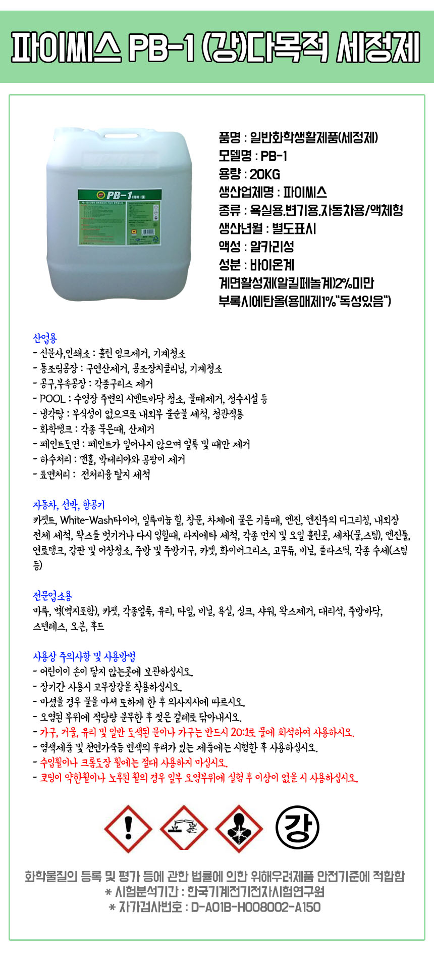 ÆÄÀ̾¾½º PB-1(°­) ´Ù¸ñÀû¼¼Á¤Á¦ 20kg/°­·Â¼¼Ã´/Àü¹®¾÷¼Ò¿ë