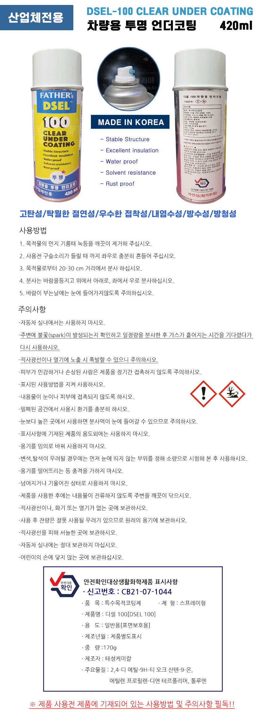 - home > ÀÚµ¿Â÷°ü¸® > Á¤ºñ/Â÷·®°ü¸® > ¹æÀ½/¹æÁø¿ëǰ > DSEL-100 Åõ¸í¾ð´õÄÚÆÃÁ¦ 420ml/ÆÄ´õ½º/µð¼¿100/½ºÇÁ·¹ÀÌ/»ê¾÷üÀü¿ë